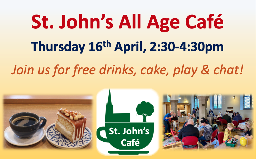 St John’s Cafe – Thursday 16th Aprilby Vicar of Ashton Hayes26/03/202626/03/2026 Do pop in for free refreshments at our next all age Church cafe on Thursday 16th April, from 2:30-4:30pm.