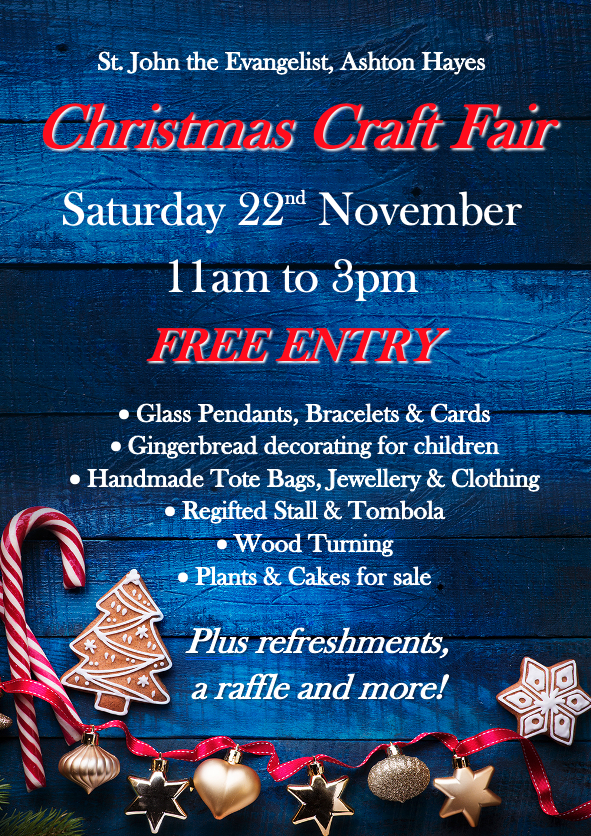 Christmas Craft Fair – Sat 22nd Novemberby Vicar of Ashton Hayes08/10/202521/10/2025 11am to 3pm, with a range of stalls and activities for all ages, plus refreshments. Entry is free!